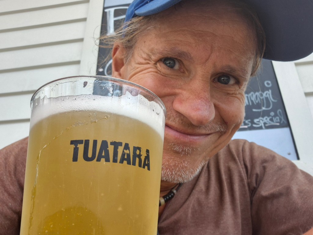 Da meine Waschmaschine nicht schleudern will, muss ich mithilfe des Tankwarts (Ja! Ihr dürft gerne nachfragen!) eine neue Runde drehen: die Wäsche in der Nachbarmaschine; ich mit dem Rad durchs Dorf. Habe dabei das sehr leckere „Tuatara Pils“ kennengelernt. Will das Schicksal mir sagen, bleib doch beim Bier…!?