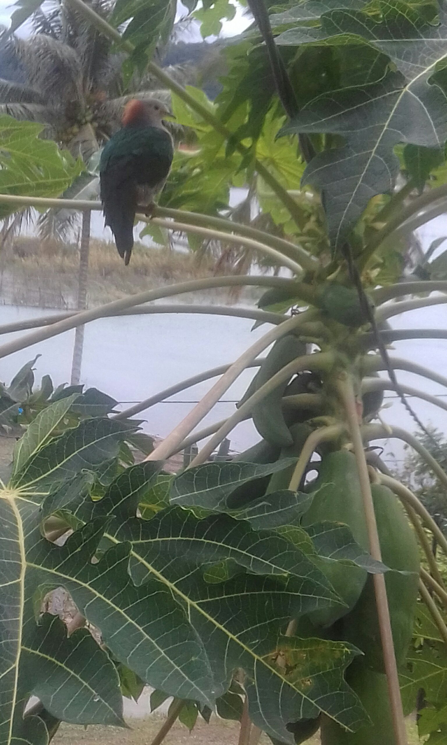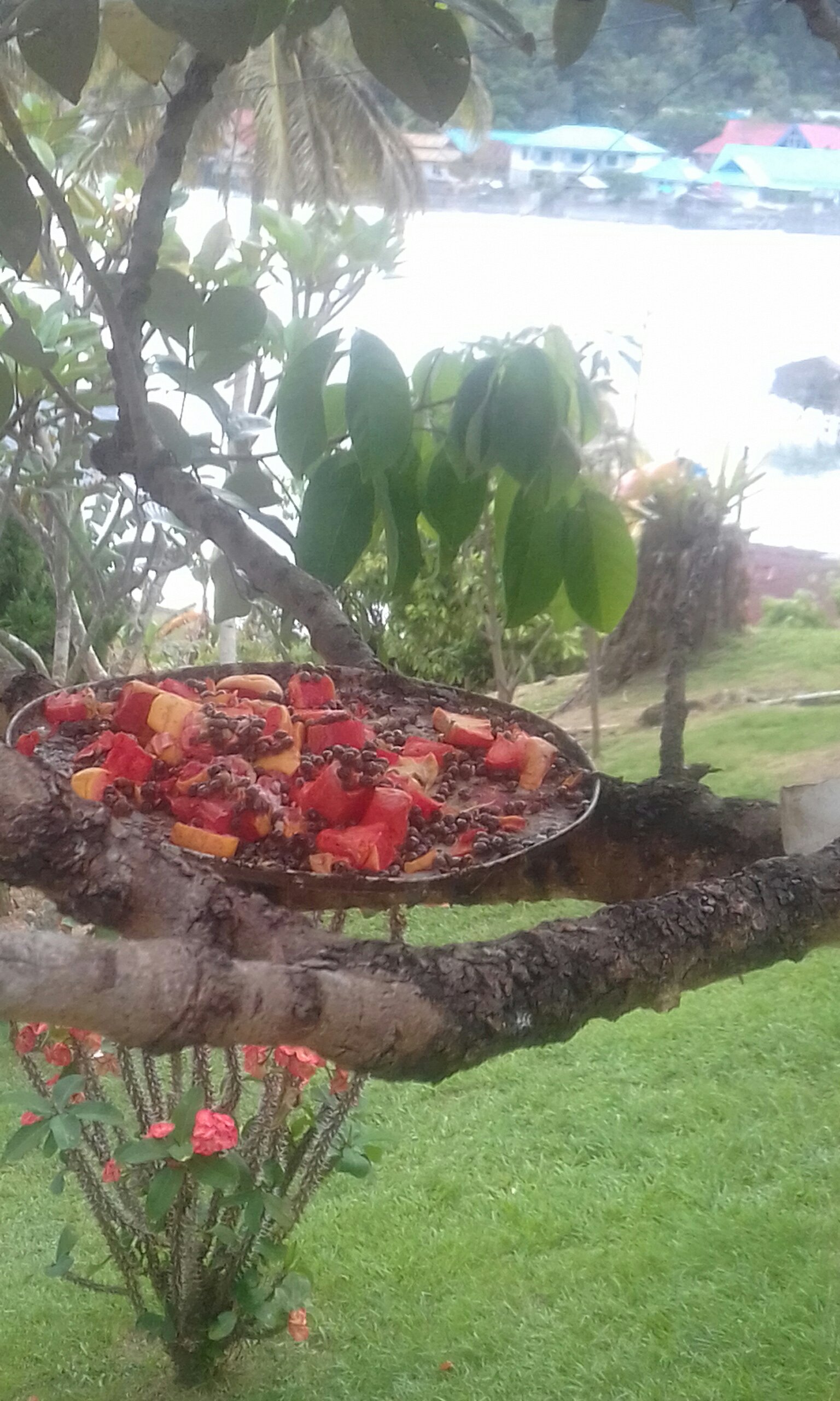 Im Garten von unserem Hostel sitzt ein fetter Vogel im Baum, der morgens immer ganz elendig schreit. Ich hab mich schon gewundert, was mit dem los ist. Heute morgen konnte ich beobachten, wie er in seinem Baum gefüttert wurde. Er hat ein Schälchen und da kommt sein Futter rein. Daraufhin klettert er eilig runter und fängt an zu schreien, als er merkt, dass es heute auch wieder bloß Papaya gibt.