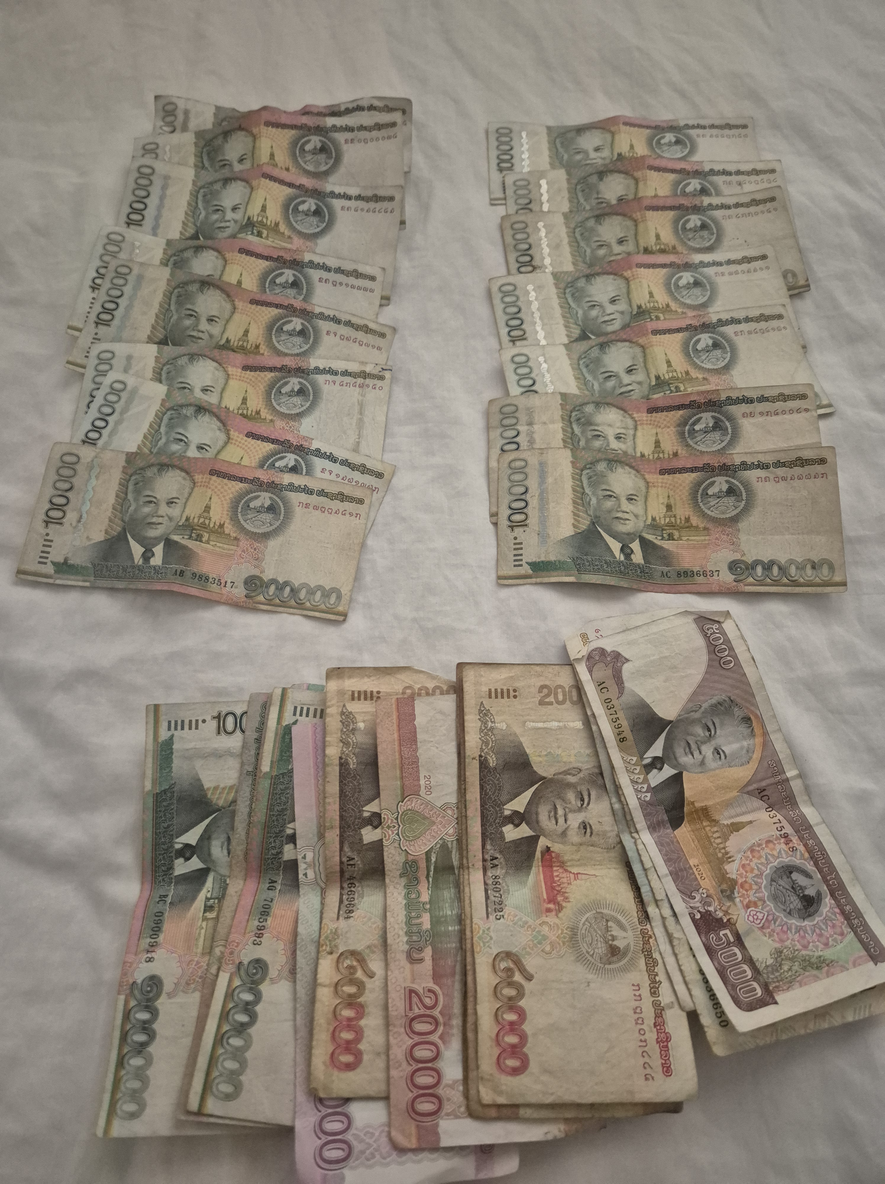 Aber so ganz ernstnehmen kann man die Währung natürlich nicht. Denn ihr größter Schein, 100000 Kip, entspricht 4 Euro. Das heißt, das Geld wird üblicherweise in Kip-Lastern ausgeliefert (sorry, aber der musste sein!). Und um noch kurz die ganzen Bildungsbürger:innen und Platin-Abonnent:innen dieses Premium-Blogs zu bedienen: auf dem 100000 Kip-Schein befindet sich das Antlitz von Kaysone Phomvihane, dem ersten Vorsitzenden der Laotischen Revolutionären Volkspartei. Präsident, Premierminister und Weggefährte Ho Chi Minhs ist der Streber auch noch gewesen. Diese Ehre entspricht in etwa dem Gegenwert von vier Euro. Naja…