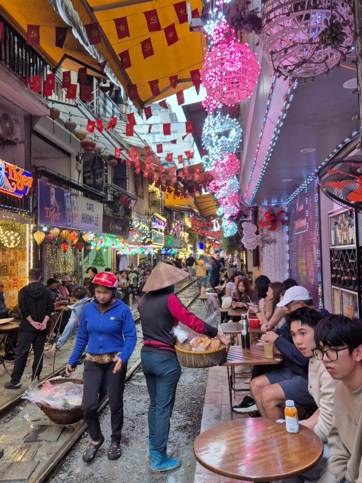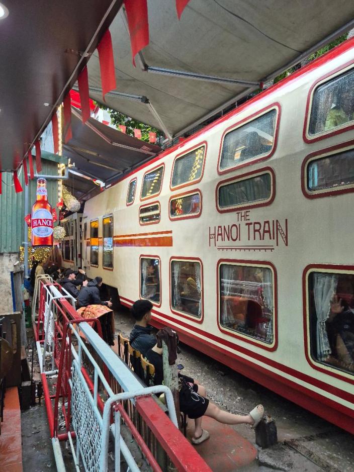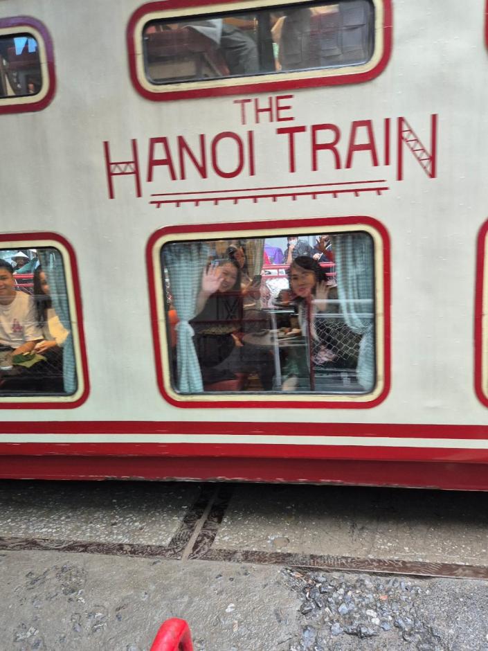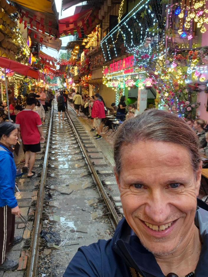Natürlich mache auch ich das, was alle in Hanoi machen. Bin ja weder etwas Besonders noch doof. Und selbstverständlich ist die Train Street supertouristisch und hat mit dem authentischen Hà Nôi, was immer das auch sein soll, nichts zu tun. Andererseits, wo sonst fährt einem ein Zug quasi über die Füße, während man entspannt in einer Bar sitzt – zugegeben mit Tausend anderen Touris. Muss ich mal meinen moralischen Kompass auf Zimmerlautstärke zusammenfalten und sagen: Enjoy the show! Schub schub!!