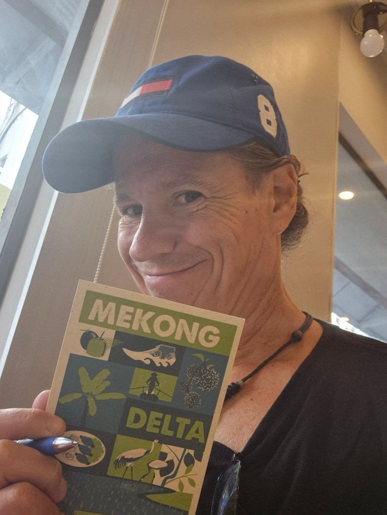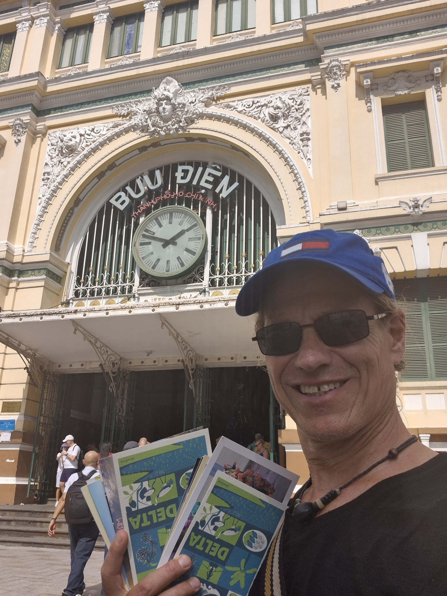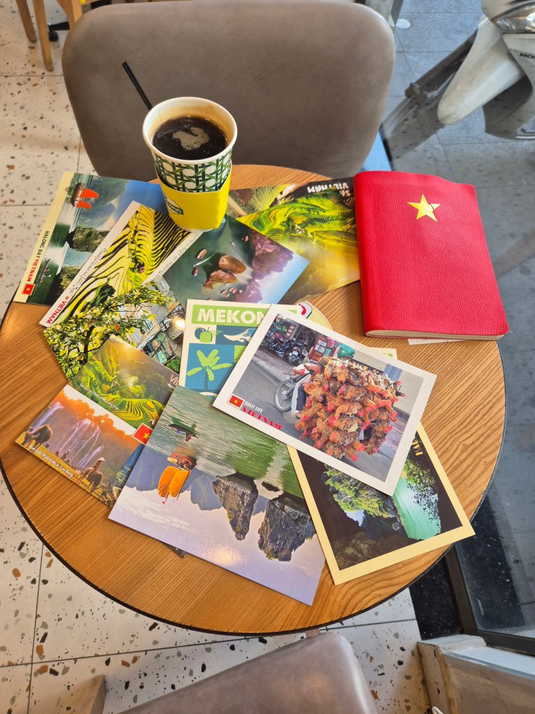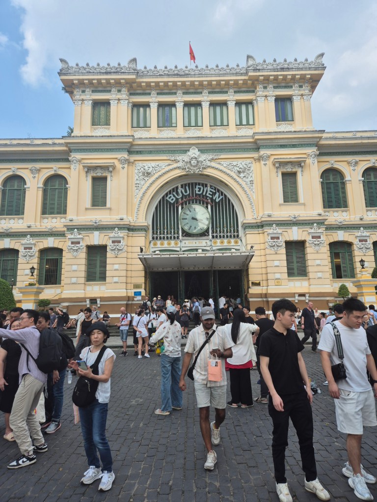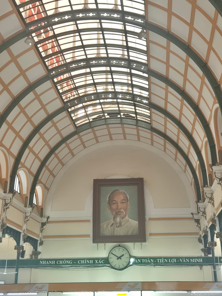 Nanu…? fragt sich Herr Boe am 1. Tag des Jahres 2026, was ist denn hier los? Hinter der Kathedrale Notre Dame von Saigon schaut ein schmuckes gelbes Gebäude hervor, das mein Reiseführer als „vollfunktionsfähiges Postamt beschreibt. Auch von innen schön und alt und viel Trubel. Es stellt sich heraus, es gibt hier (verrückte Kombination und einzigartig in Südostasien) am gleichen Platz, so als wäre es erlaubt, Postkarten UND (!!) Briefmarken zu erwerben. Hammer Geschäftsidee. Dass niemand vorher drauf gekommen ist! Postkarten findet man sonst natürlich auch, aber treibe in Asien mal eine vollfunktionsfähige Briefmarke auf…!