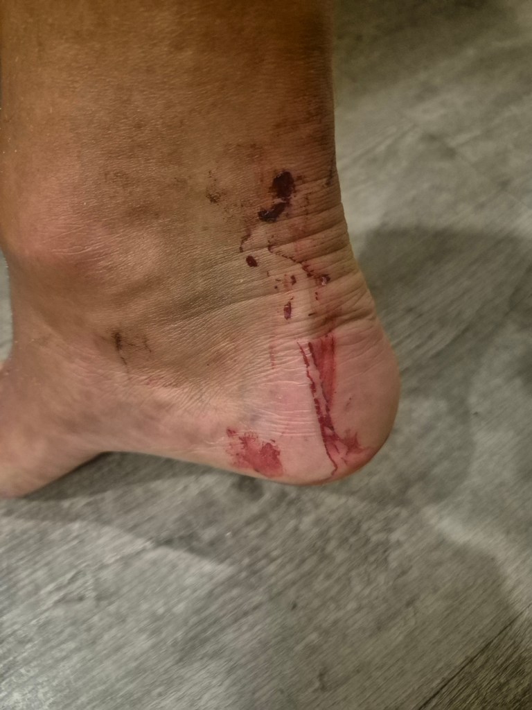 Nach meiner Wanderung rund um die berühmten „Three Sisters“ entdecke ich bei meiner Kaffeepause, dass an meiner rechten Socke ein schleimiges, nacktschneckenartiges Vieh hängt. Ihhh! Ich zupfe es ab, was gar nicht so einfach ist. Es stellt sich heraus, es war gar nicht an meiner Socke interessiert, sondern an meinem Blut. Denn inzwischen hatte es sich durch die Socke fest in meiner Ferse verschraubt.