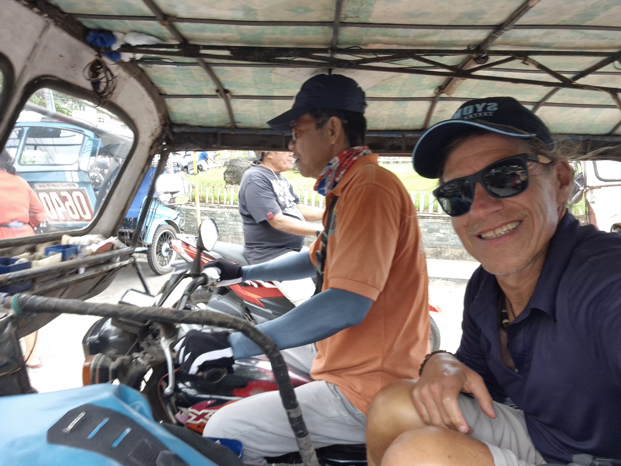 Der Morgen beginnt sehr früh (ich wecke die umliegenden Hähne um 5:00 Uhr) und mit einem Black-out genau in dem Moment, in dem ich meine zweite Kontaktlinse eingelegt habe (Glück gehabt). Ich laufe im Dunkeln zum Treffpunkt, von dem ich um 5:30 abgeholt werden soll. Zwanzig Minuten später erscheint mein Typ mit einem Moto, um mir zu berichten, dass der Bootstrip nach Oslob, von wo ich zu meiner kleiner Insel, Apo Island, weiterreisen möchte, wegen zu starken Wellenganges gecancelt worden ist. Change of plans! Zuerst soll ich aber noch meine Anzahlung von 500 Pesos wiederbekommen. Dafür muss ich allerdings zur Office nach Alona Beach, weil so viel Geld (ca. 7,50 €) hat er nicht dabei. Ich schnappe mir ein Tuktuk und folge ihm und muss dann noch mal zehn Minuten warten, um mein Geld zu bekommen. Inzwischen steht mein Plan B: Von Tagliban Port gibt’s wohl eine richtige Fähre direkt nach Dumaguete City. Okay! Let’s go! Ich investiere mein Deposit ins Tuktuk und lasse mich ca. 40 Minuten zum Port fahren. Das sollte klappen, sofern die Fährverbindungen stimmen. Wir knattern durch den Morgen. Herr Boe lehnt genießend sich zurück: That’s the Reise-Feeling, Freunde!