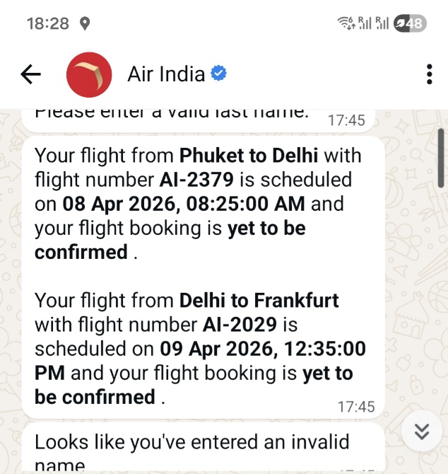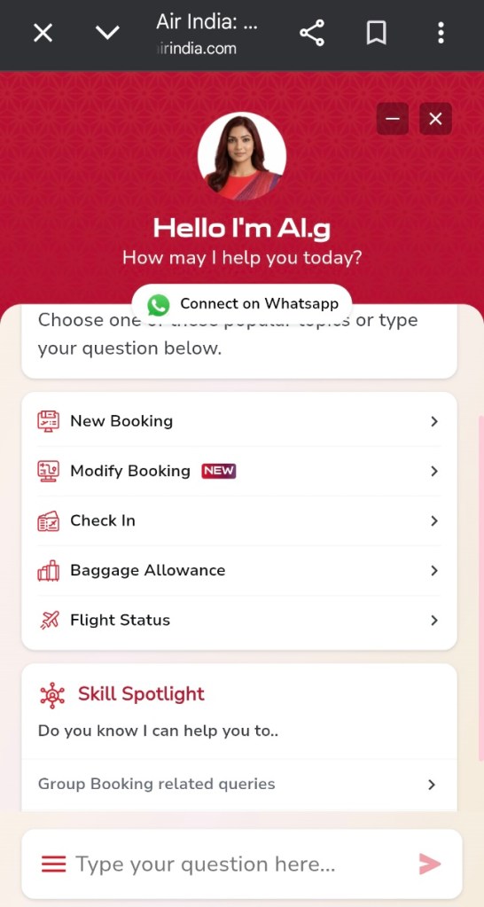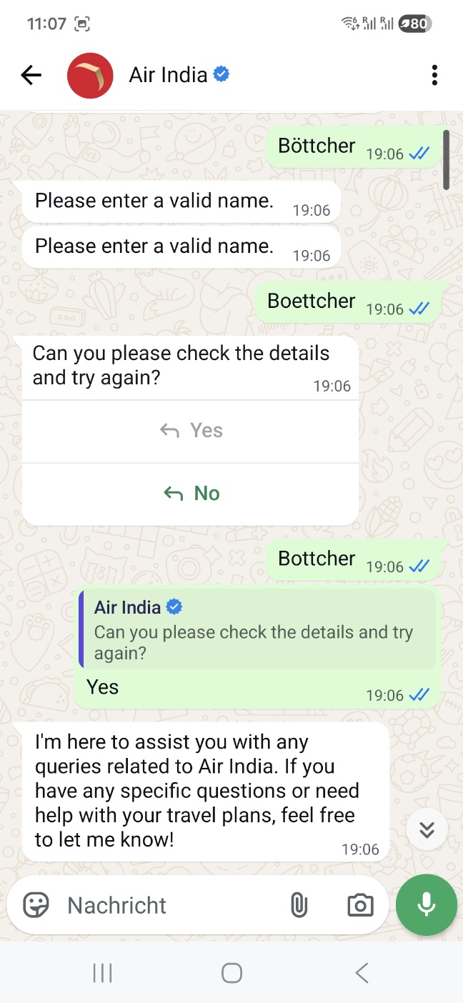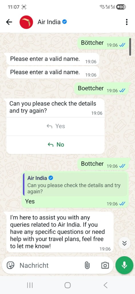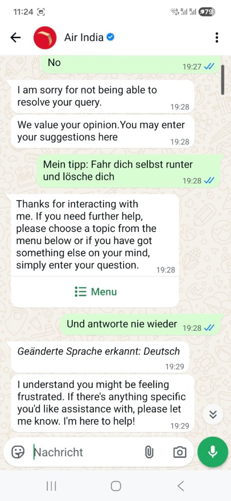 Irgendwie faszinierend, der Chat läuft über WhatsApp und beginnt mit der Nachricht von Air India mit dem Canceln des Flugs. Der Chatbot kann diese Info aber nicht einsehen. Ich versuche, dem Bot die eigene Info zuzuschicken, damit er mein Problem erkennt. Das klappt natürlich nicht. Aber „If you need further help…!“ Jaaaa…! Fresse!