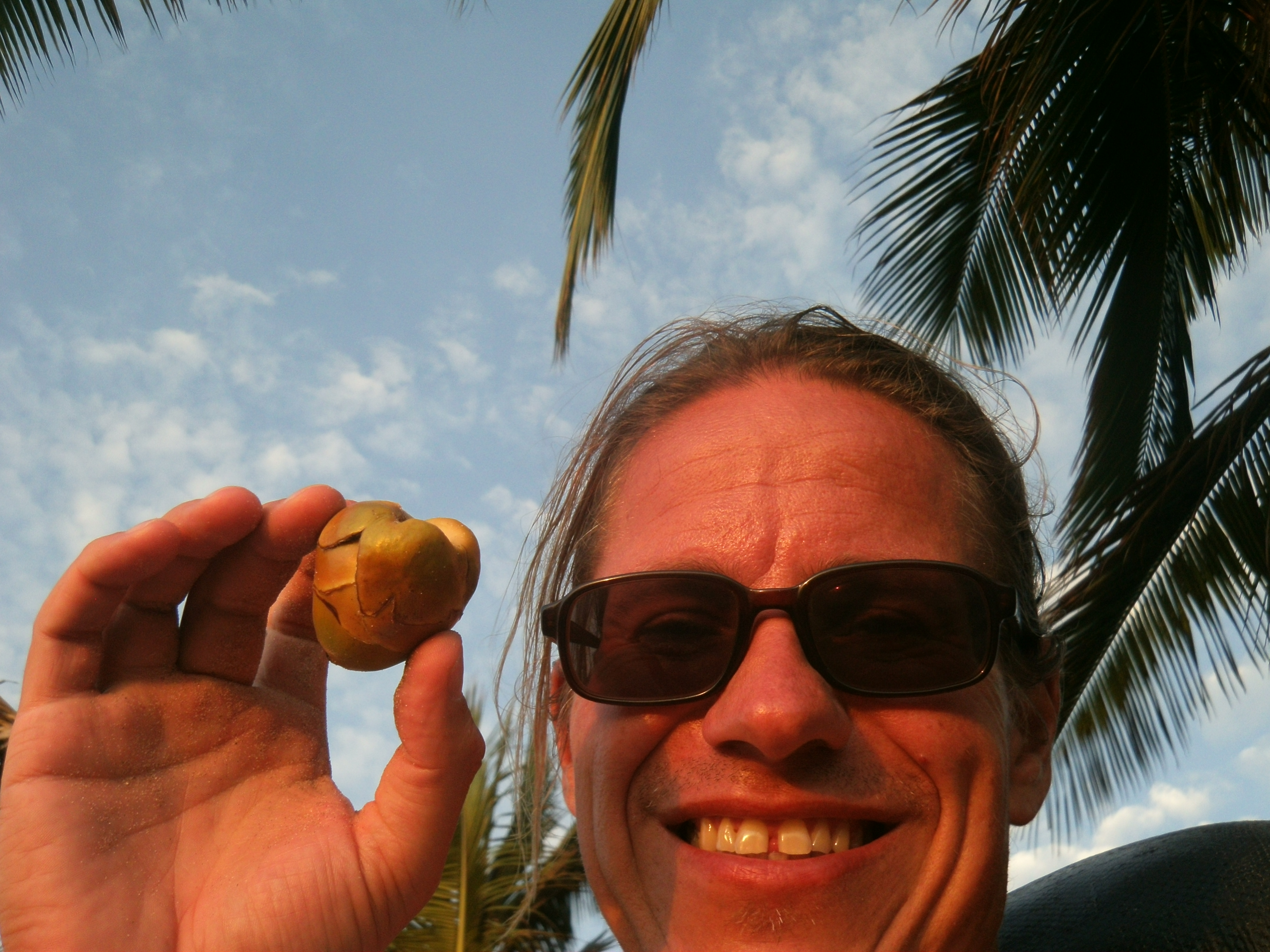 Ach, wie komme ich darauf? Meinem Surflehrer fehlt der linke Arm, nachdem ihm ganz blöd eine Kokosnuss, neh ein Hai, neh Blödsinn! Ich sitze am Strand und genieße meinen letzten pazifischen Sonnenuntergang, als einen halben Meter neben mir eine Kokosnuss im Sand einschlägt! Ungelogen! (Fotobeweis mit besagter Kokosnuss!) Glück gehabt! In einem anderen Raum-Zeit-Kontinuum, etwa ein Dreivierteljahr später und etwas weiter rechts, müssten sich die Haie ganz schön anstrengen, um ihre Statistik gegenüber den blöden Nüssen aufzupolieren. Die armen Haie werden inzwischen von nahezu allen anderen Fischen gemobbt, weil selbst Fallobst gefährlicher sei als sie (Woher die Fische eigentlich wissen, dass die Kokosnuss gar keine Nuss sondern Obst ist, ist mir unbekannt. Das war mir selbst gar nicht klar gewesen, hätten mich die Fische nicht aufgeklärt!)