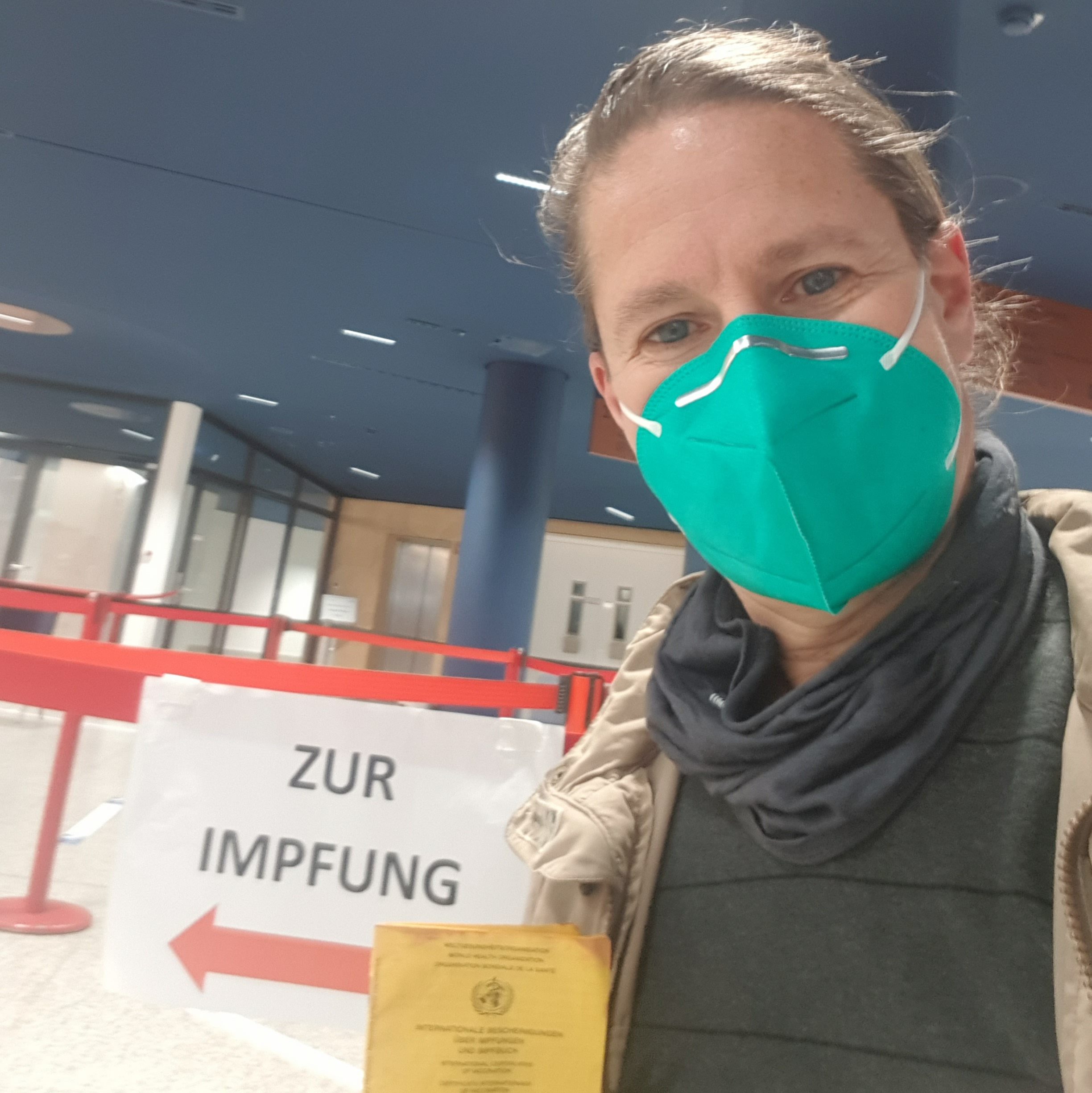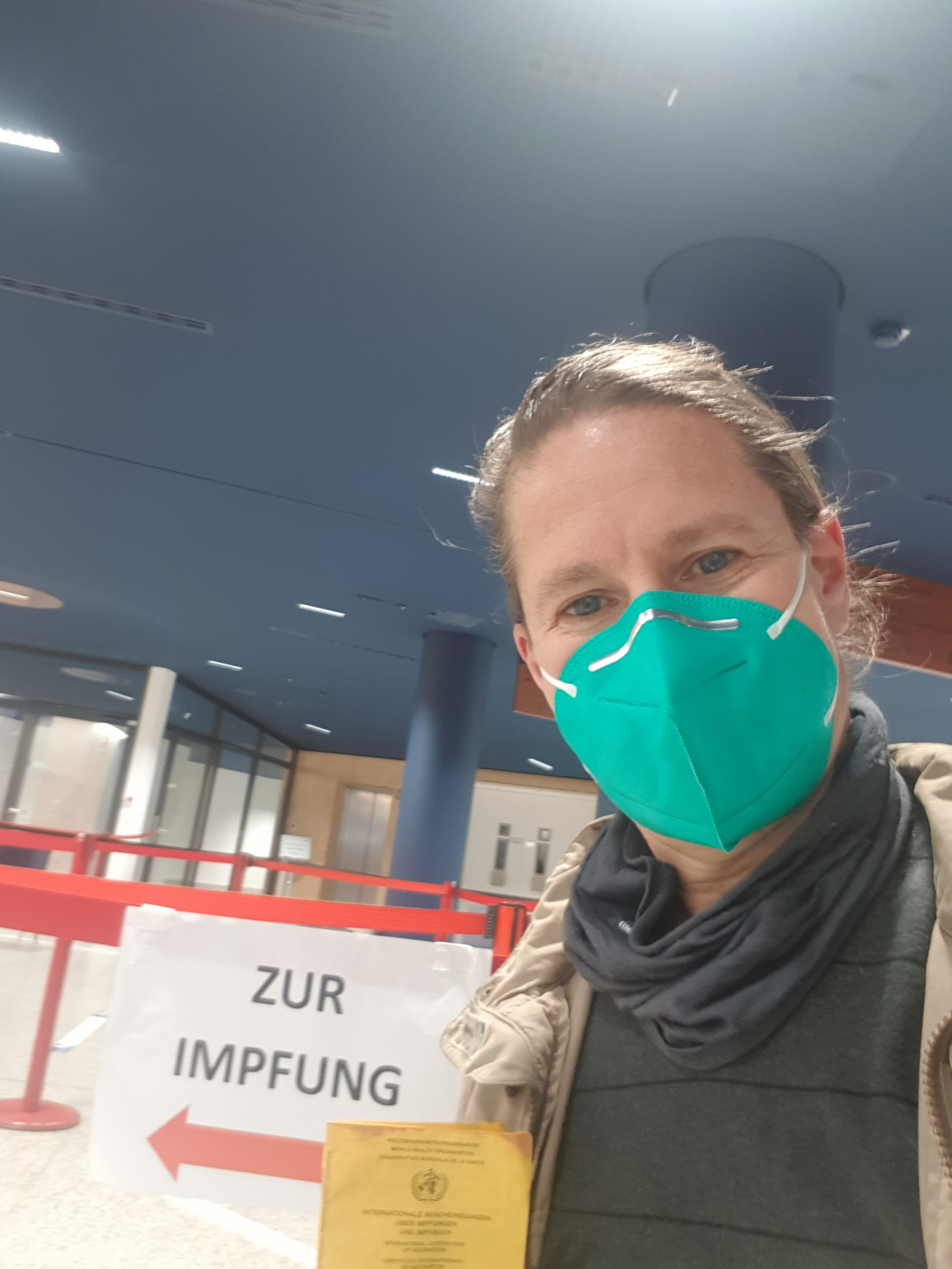 Eine Medizinstudentin scannt meine Buchung, lacht, schaut mich an, dann noch mal auf den Bildschirm und lacht noch mal: „Sie sind aber nicht Jutta!“ Ich sage schnell und mit verstellter Stimme: „Doch!“ Schließlich will ich meinen Impfstoff!!! – Ich gebe dann zu, dass ich doch nicht Jutta bin, aber bekomme trotzdem ihren, äh, meinen Stoff! Puh! – Aber so ganz ohne Zwischenfall hätte ich mich wahrscheinlich auch ein bisschen verarscht gefühlt…!