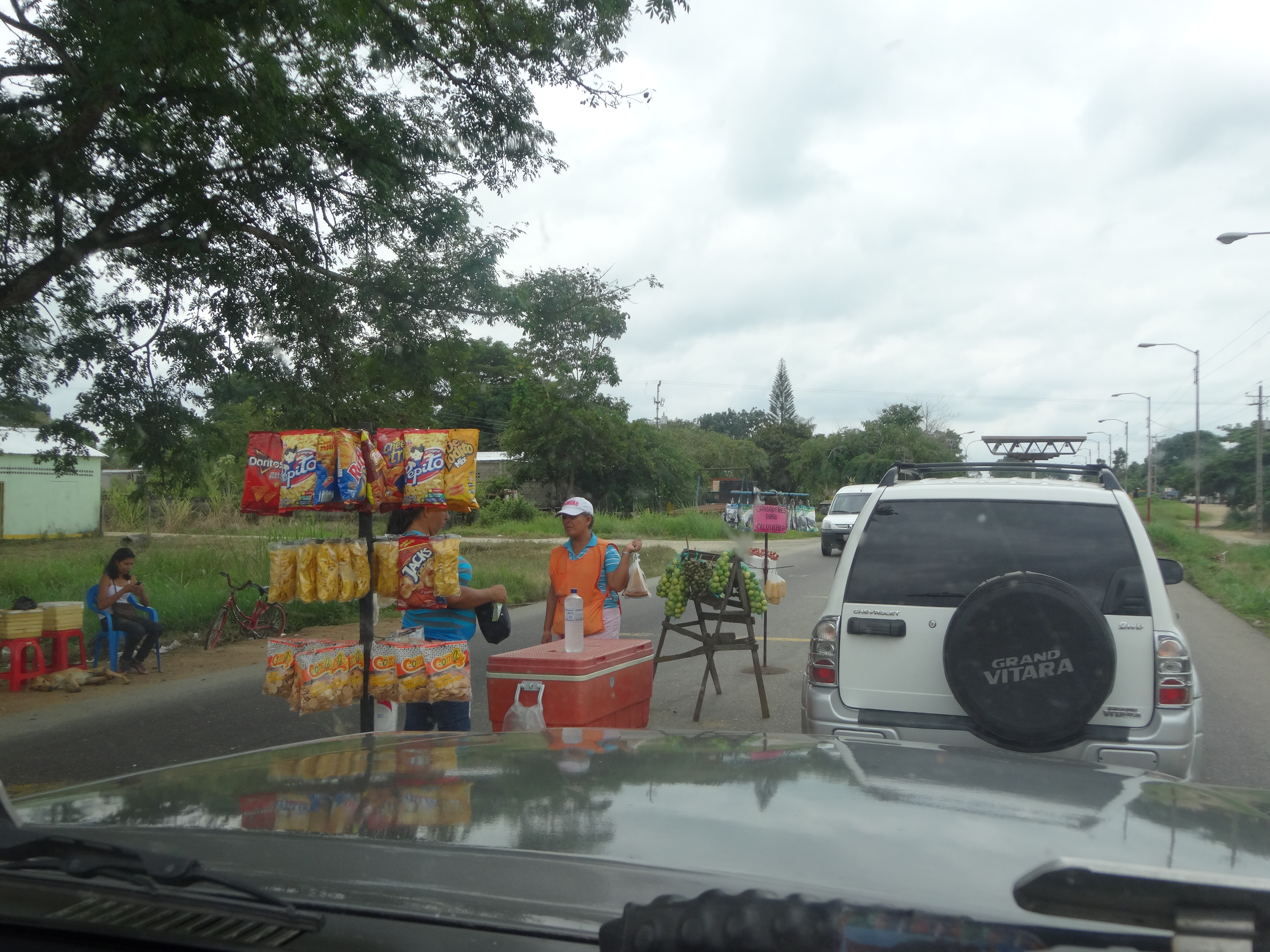 Das Schöne an diesen asphaltischen Bremsbuckeln ist, dass an diesen Stellen der Geschwindigkeitsreduzierung haufenweise Dienstleister herumlungern (siehe Fotos!). Bremsverhalten und Verkäuferdichte stehen hier in signifikantem Zusammenhang. Und da man eh bremsen muss, kann man sich ja auch ein paar Tostones (Bananenchips) oder was auch immer durchs Fenster reichen lassen.