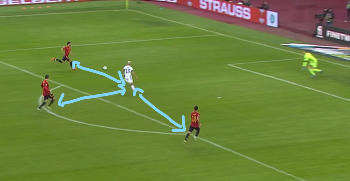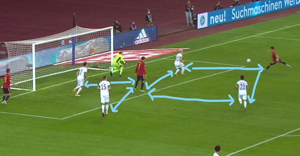 Nach dem Ukraine-Spiele und aufgrund der akuten Infektionsgefährdung entschied sich Löw für die Partie gegen Spanien auf eine neuartige „Weder-Mann-noch-Raumdeckung“. Denn, so Jogi Löw, „der Fußball muss halt auch irgendwie ein Stückweit Vorbildfunktion sein.“ Und in den allermeisten Situationen sei es im Spiel auch erfolgreich gelungen, das notwendige Abstandsgebot einzuhalten, was gerade in Standardsituation gar nicht immer so leicht umzusetzen sei.