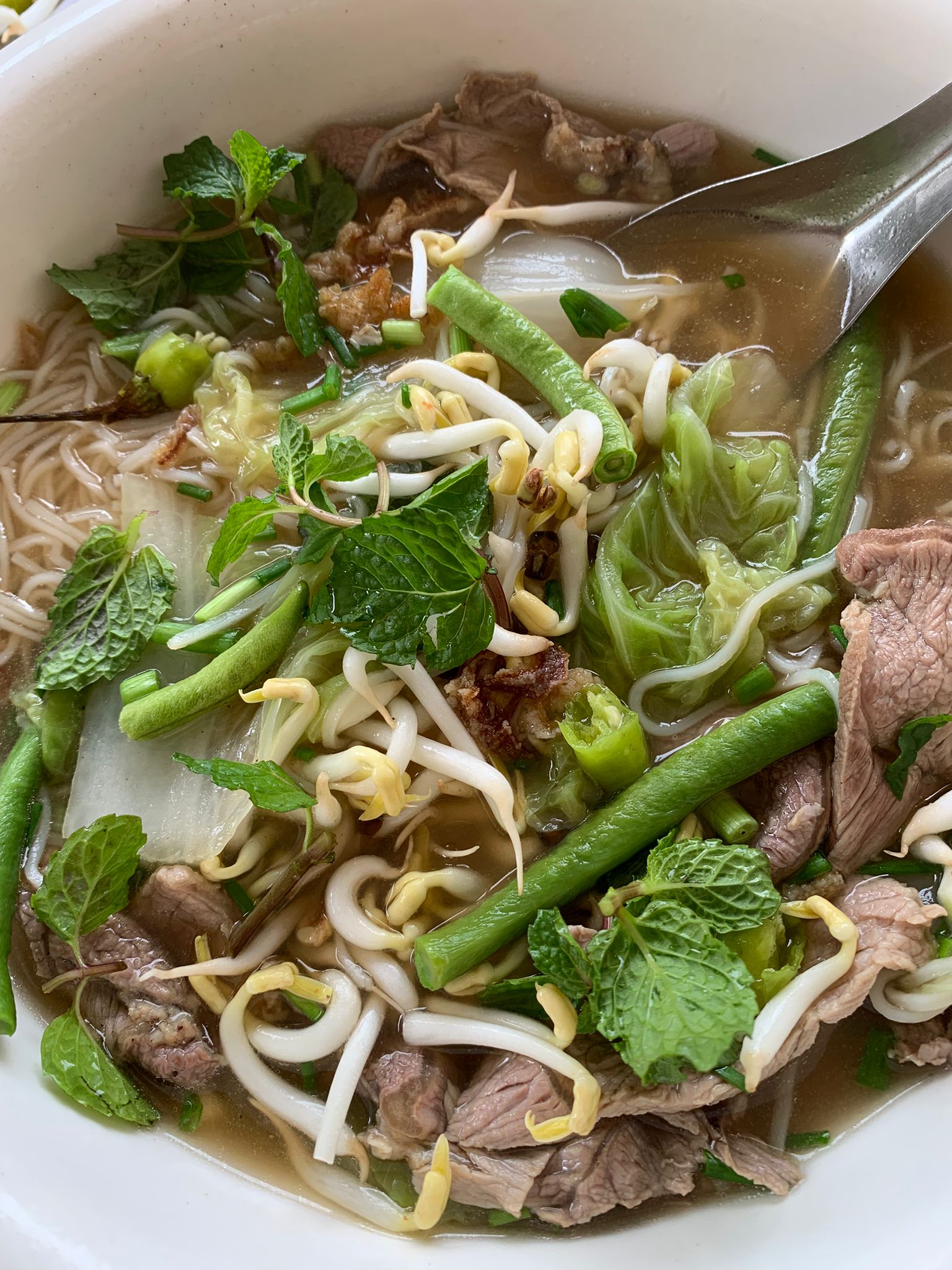 Die vergangenen Tage war ich mit meiner Reiseteilzeitbegleiterin wandern und hier geht’s höhentechnisch ordentlich zur Sache. Dafür braucht’s Energie und meine Wanderbegleitung achtet sehr darauf, die Energiespeicher aufzufüllen, bevor es losgeht. Und hin und wieder lasse selbst ich mich von vernunftbezogenen Argumenten überzeugen und auf diesem Umwege komme ich nun regelmäßig zu meinem Frühstückssüppchen, wofür ich inzwischen durchaus dankbar bin. Und diese in Laos typische Nudelsuppe, „Khao Piak Sen“, ähnlich der bekannten „Pho“ in Vietnam, hat es in sich. Neben den Nudeln kommen Gemüse, wahlweise Fleisch, und immer fangfrische Kräuter, Limette, Chili und Salat auf den Tisch, die man sich nach Belieben in die Suppe schmeißen kann. Es gibt also zum einen ordentlich Energie zum Wandern, ist zudem unglaublich lecker und wärmt einen morgens richtig auf.