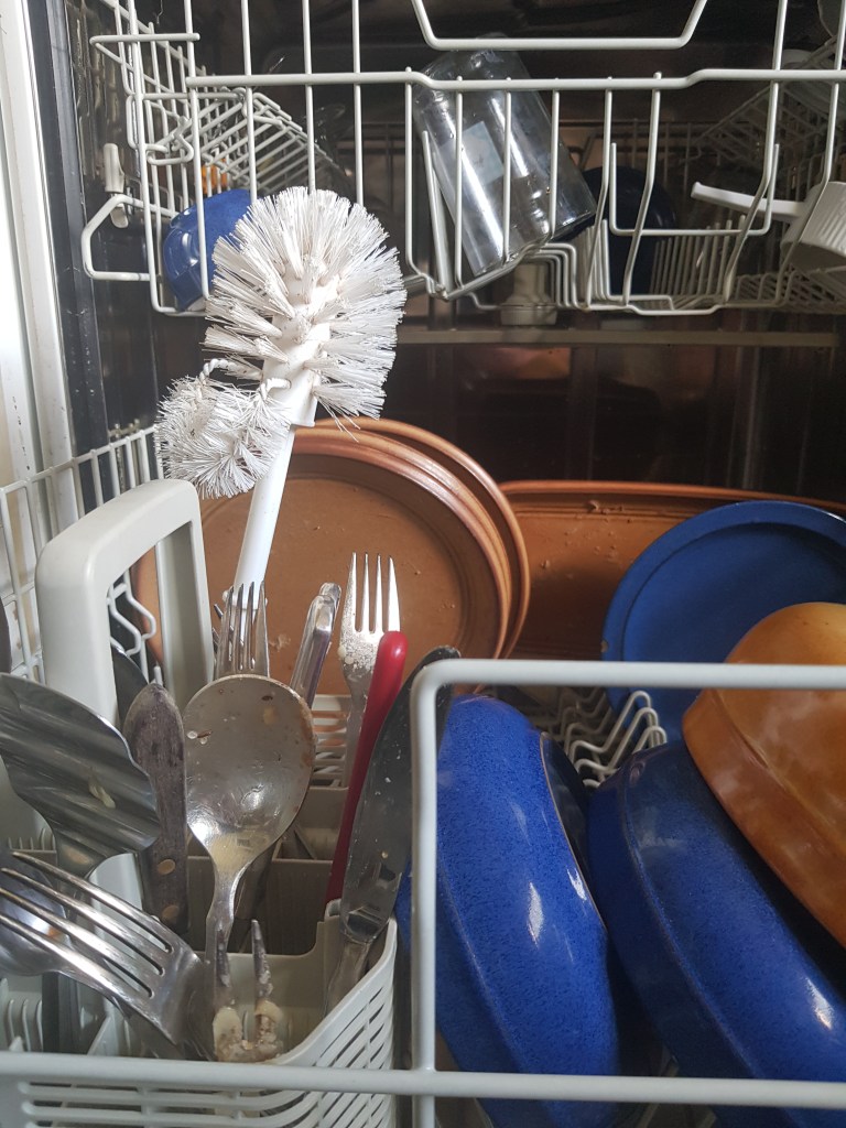 Noch bevor mich ein Mitbewohner mit der neuen Bürste gesehen hatte, war ich in der Küche, hatte die Spülmaschine geöffnet, die neue Bürste im Geschirr platziert, die Maschine wieder geschlossen und den Spülvorgang gestartet. Pfeifend verließ ich die Wohnung und machte mich auf den Weg in die Uni.
