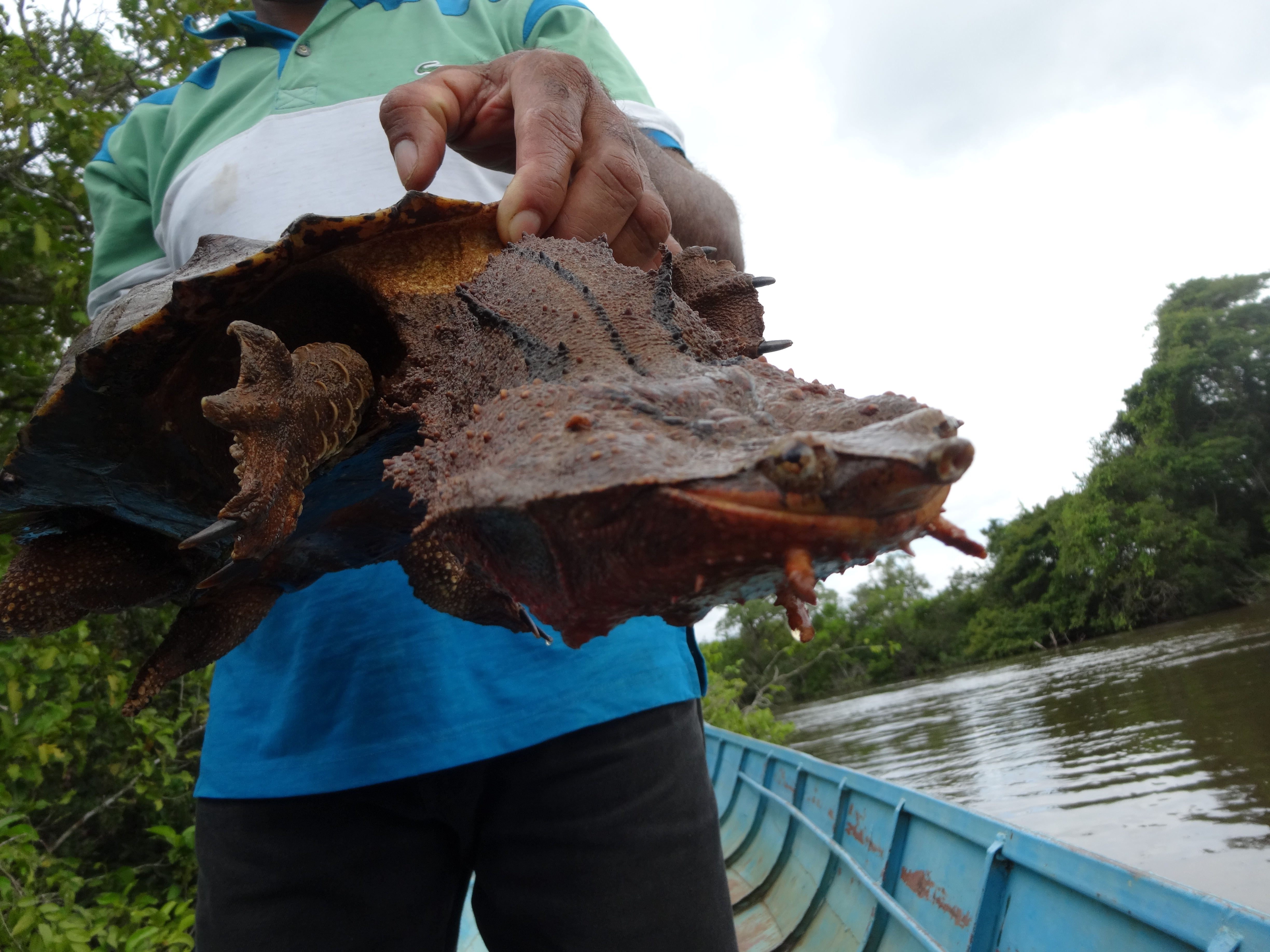 Kommen wir also zu etwas Erfreulichem. Denn es gab auch richtige Tiere zu sehen: Ameisenbär in gespreiztem Galopp mit wehendem Schweif, eine süße Baumboa, eine 3 Meter kleine, aber wunderschöne Anaconda, eine Tortuga mata mata, so eine Urzeitschildkröte mit langem, ungemein hässlichem Reptilienhals, obligatorische Brüllaffen und, meine Damen und Herren, schnallen Sie sich fest, sperren Sie Ihre Kinder weg, wir haben tatsächlich diese rosafarbenen Flussdelphine gesehen! – Nein! Doch! Oh! – Rosafarbene Flussdelphine – geht’s noch?! Dagegen können doch mal echt alle Vögel ihre Federn einpacken und sich in ihre Winterquartiere verziehen!