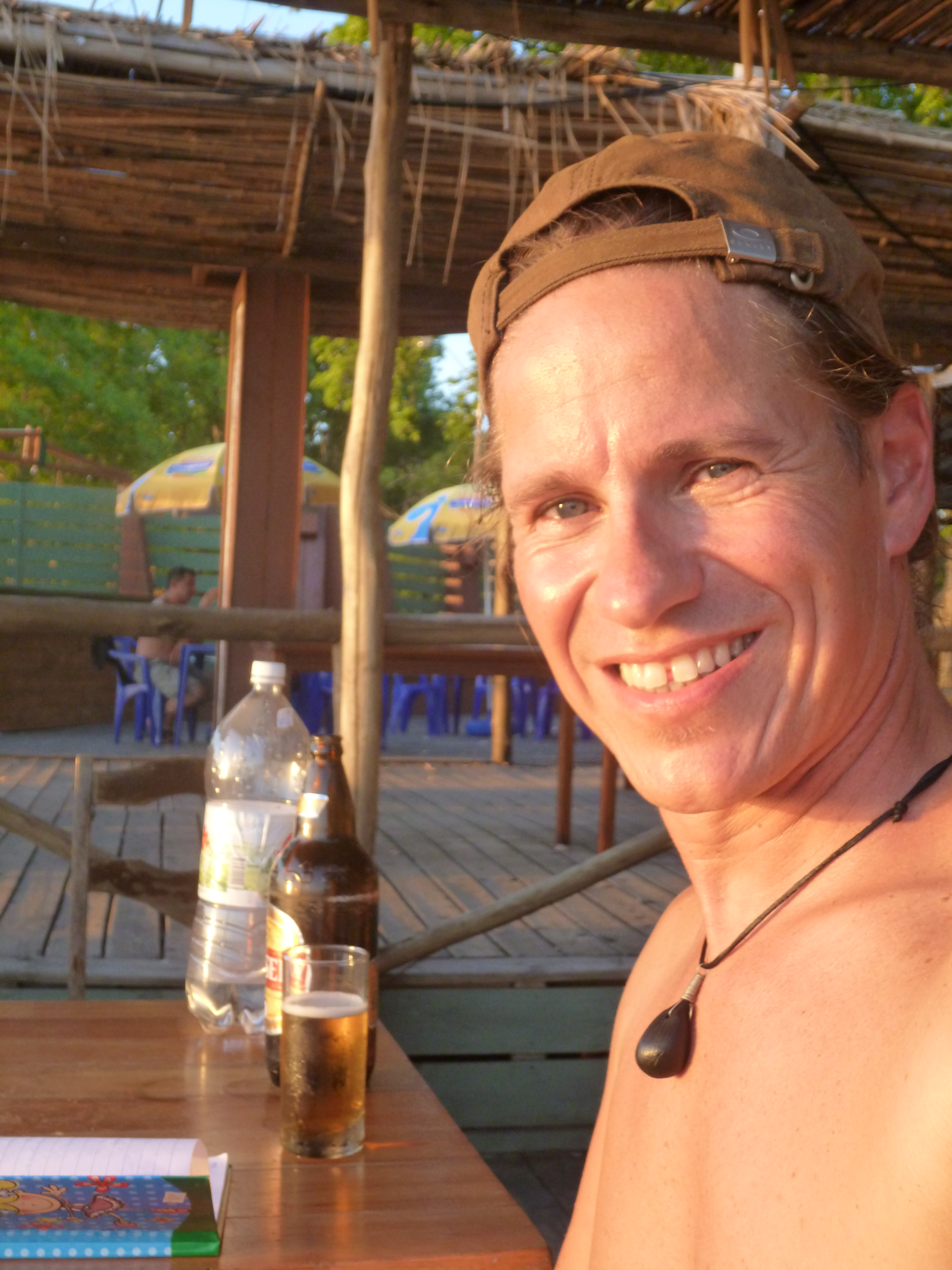 Heute (in Carmelo/Uruguay) bin ich erst um 19:30 an den Strand des Rio de la Plata gegangen. Davor war’s einfach zu heiß, liebe Freunde. Die Frau von der Rezeption meint allerdings, dass es diesen Sommer in Uruguay extrem sei. Na, immerhin. Das Wasser verspricht keine große Abkühlung. Es ist bis 100 Meter weit noch nicht mal hüfttief und dementsprechend aufgewärmt. Zumindest das Bier wird eiskalt serviert. Nicht so wie in Deutschland! Denn das eine wissen die Menschen in Südamerika über Deutschland. Und ständig werde ich darauf angesprochen, in Deutschland trinke man das Bier doch „caliente“, nicht wahr? Wobei „caliente“ warm oder auch heiß bedeuten kann. Ich muss daraufhin ganz Südamerika aufklären, dass wir unser Bier NICHT warm trinken. Apropos Bier: das war mein Stichwort! Prost!