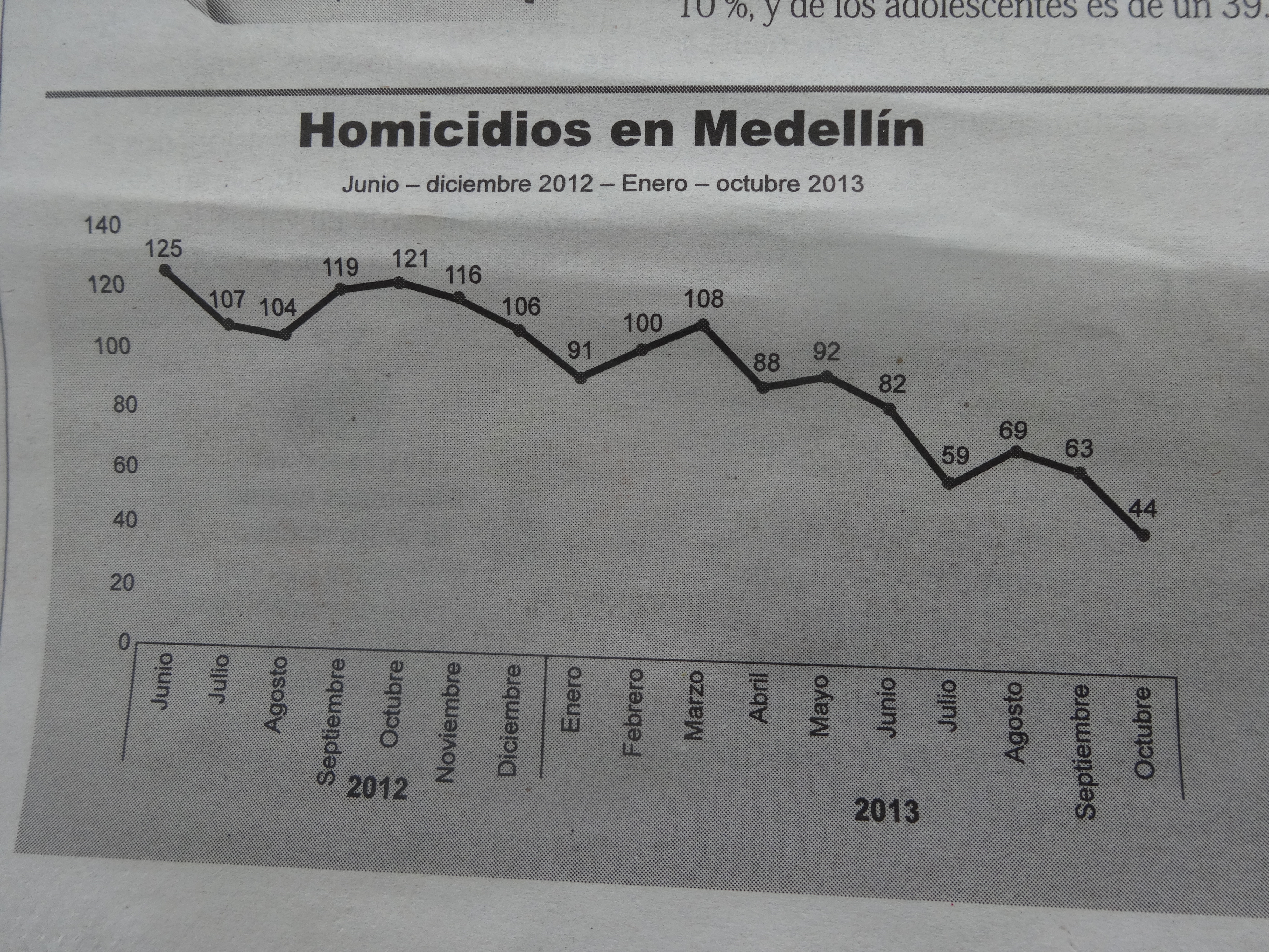 In Medellín habe in Statistik dazu in der Zeitung gefunden. Sie befasst sich mit der Mordsrate in der Stadt. Und siehe da, der zurückliegende Monat Oktober war mit 44 Morden der mordärmste Monat seit 30 Jahren. Überhaupt hat es 2013 schon 31 mordfreie Tage gegeben.