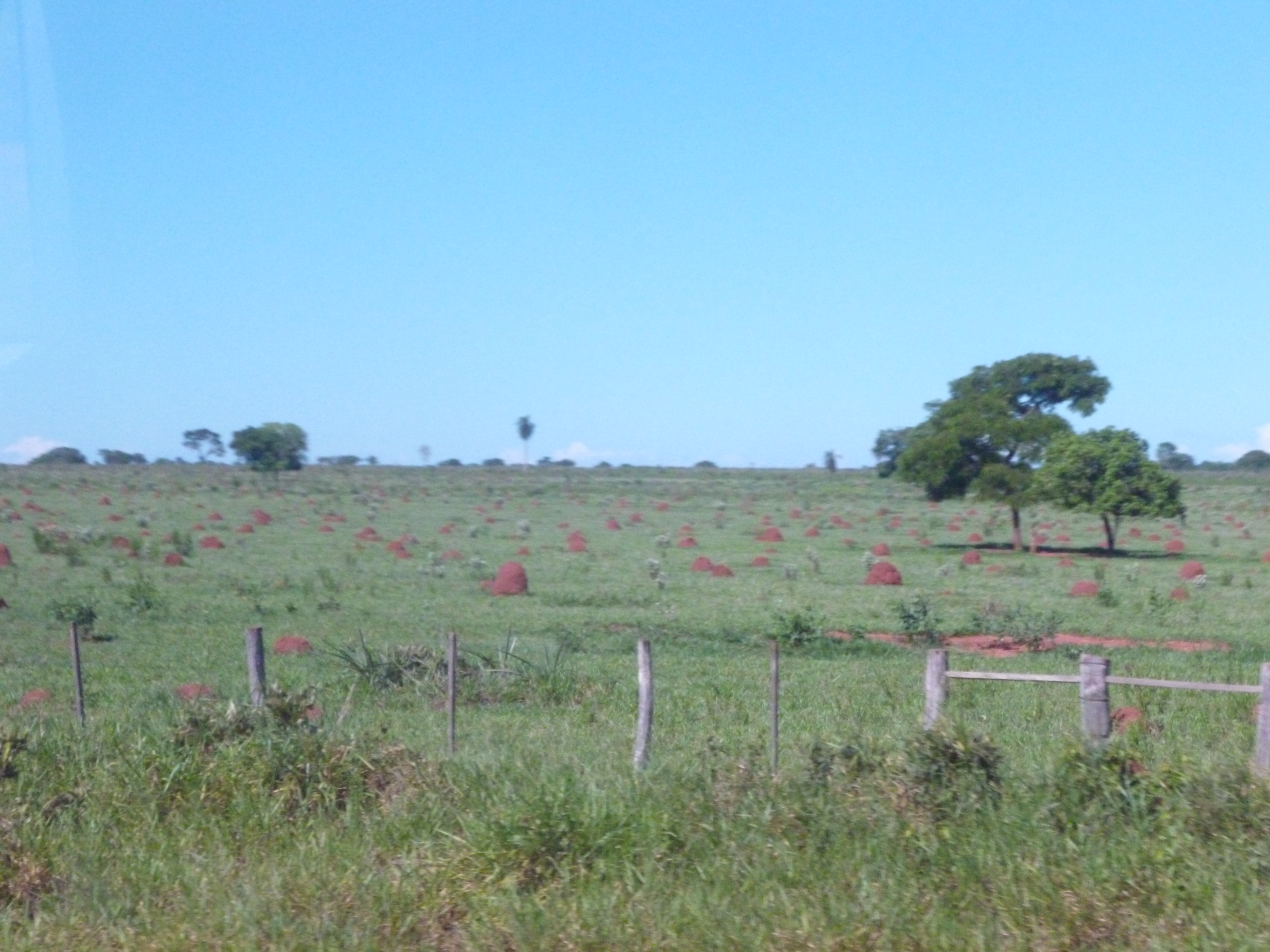 Der Mato Grosso in Brasilien ist neben dem Pantanal für seine intensive extensive landwirtschaftliche Nutzung bekannt. Zum einen wird hier für den Weltfuttermarkt und die Ethanolherstellung Soja angebaut und zum anderen: Was bietet sich auf einer seeehr großen, sehr ebenen Fläche bei schlechter Bodenqualität an? Viehwirtschaft, richtig! Es stehen also Rinder in der Gegend herum. An dem am Fenster vorbeifliegenden Bild ändert sich (ohne Übertreibung) über 500 Kilometer lang überhaupt nichts. Eintönig! Die Straße geht schnurgeradeaus. Links wie rechts Weideflächen und hin und wieder stehen sogar mal Rinder drauf. Aber extrem extensiv!